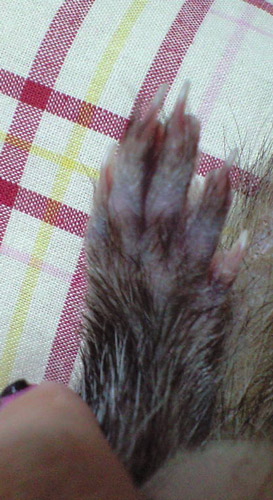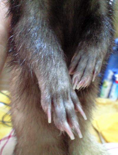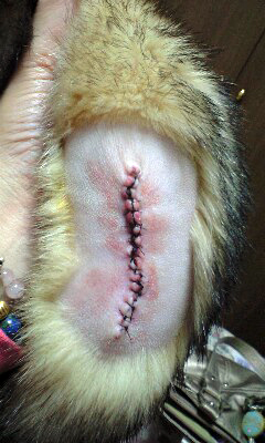 《ブルーフェレット症候群は、四肢や顔面周囲、剃毛部位などが、青く染まった状態で、これは、正常な状態で、これから、発毛してくる前段階です。ホルモンの関係であろうといわれています》